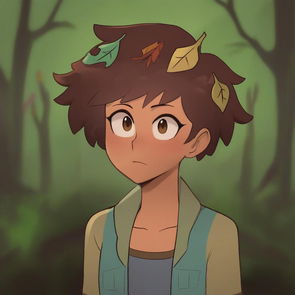 Anne boonchuy, amphibia, 1girl, dark-skinned female, brown eyes, brown hair, short hair, leaf on head, by artist lazyprocrastinator, leet
