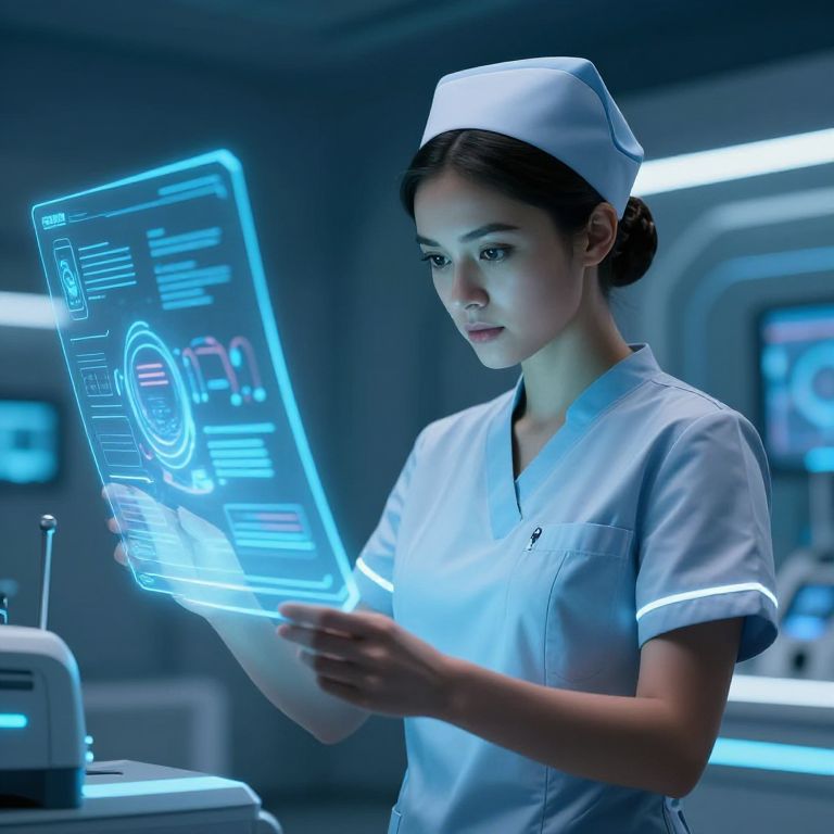 Photograph of a young, light-skinned woman with dark brown hair in a white nurse cap and blue-gray scrub top, standing in a futuristic, blue-lit medical lab. She is holding a glowing, holographic tablet displaying medical data, including a patient's chart with vitals and icons. The background features sleek, metallic surfaces and blurred medical equipment. Her focused expression and the high-tech environment suggest a modern, advanced healthcare setting. The image has a sci-fi aesthetic with neon blue lighting and crisp, clean lines.
