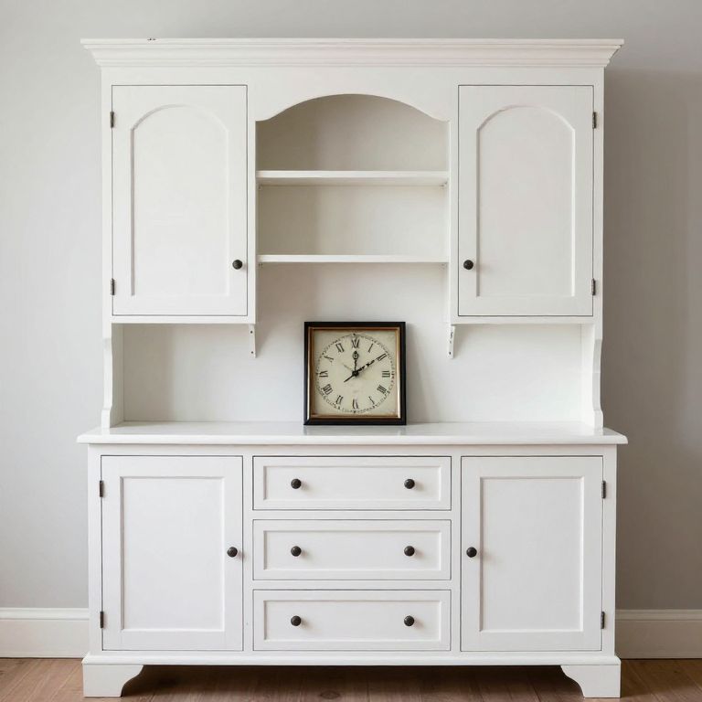 Photograph of a white wooden hutch with arched top, three upper cabinets, two lower drawers, a central clock, and a light gray wall
