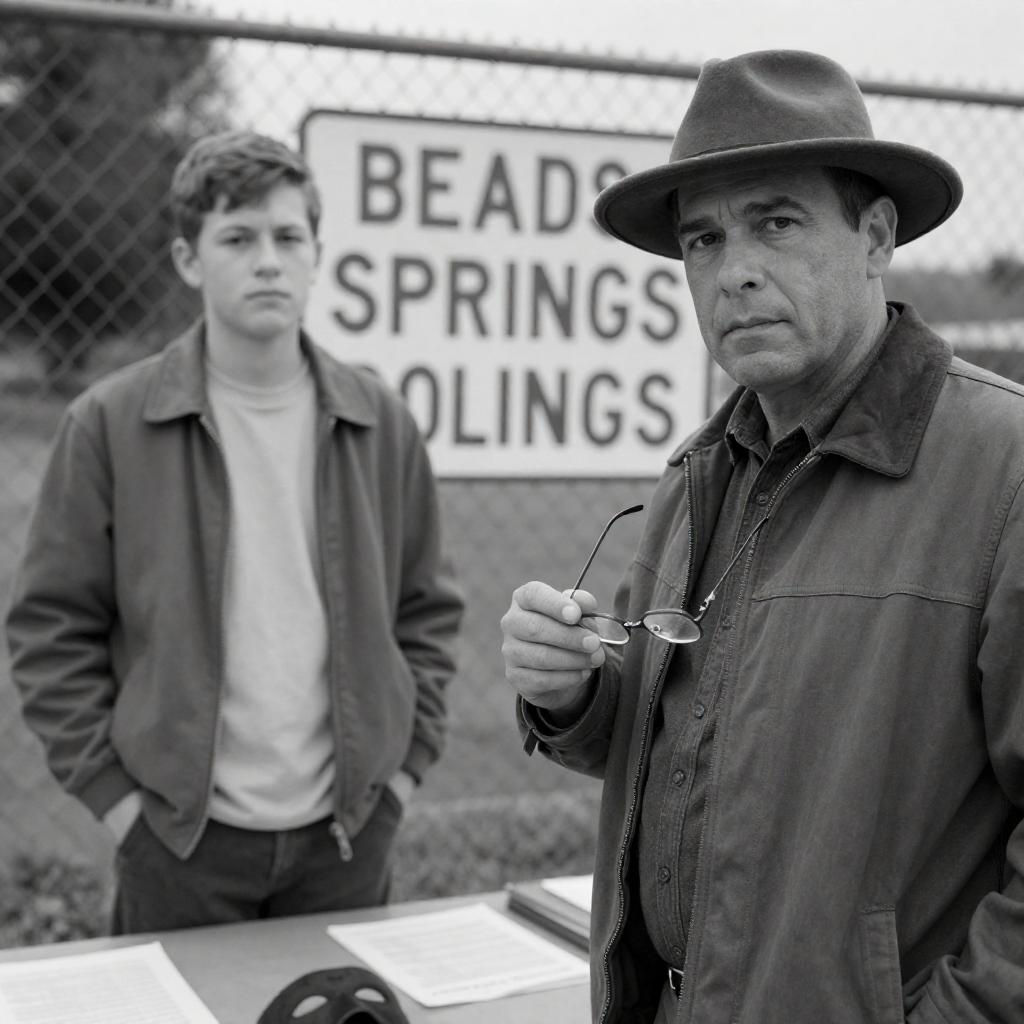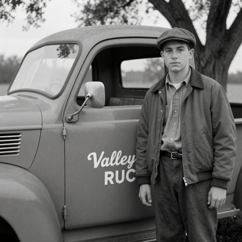 Black-and-white photograph of a young man in a flat cap and jacket standing beside a vintage pickup truck with "Valley Truck" written on the side. The truck's cab is open, and a tree with visible bark ure is in the background. The man looks directly at the camera with a neutral expression.