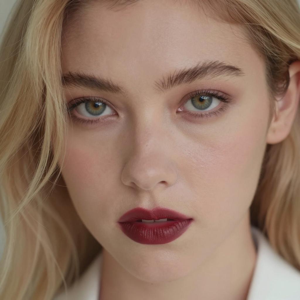 Close-up portrait of a blonde Caucasian woman with light skin and blue eyes. She is wearing pink eyeshadow and red lipstick. Half of her face is softly lit from the left side, creating shadow contrast with a dark background. Her expression is neutral.