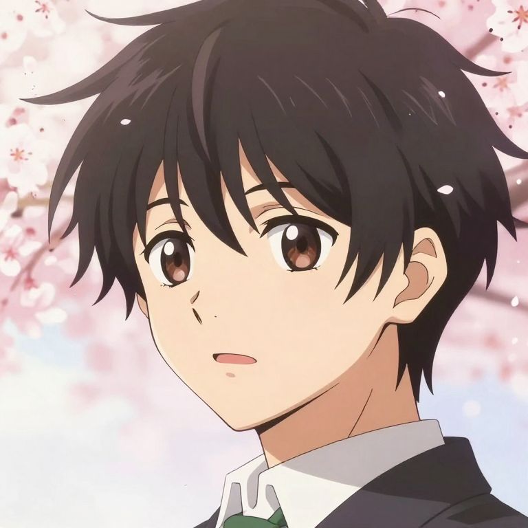 Anime-style digital drawing of a young boy with black, tousled hair, brown eyes, and a white collared shirt, against a cherry blossom background
