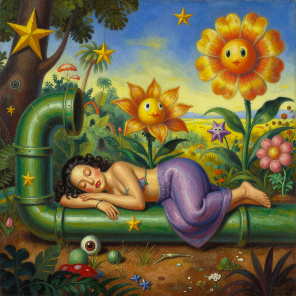 Retro Collectibles surrealist painting merging Edouard Manet's Olympia with retro film noir, super flowers and super stars melted over green pipes set in Mario's game world, vivid and colorful, maintaining Manet's style and sense of movement, whimsical and playful atmosphere
