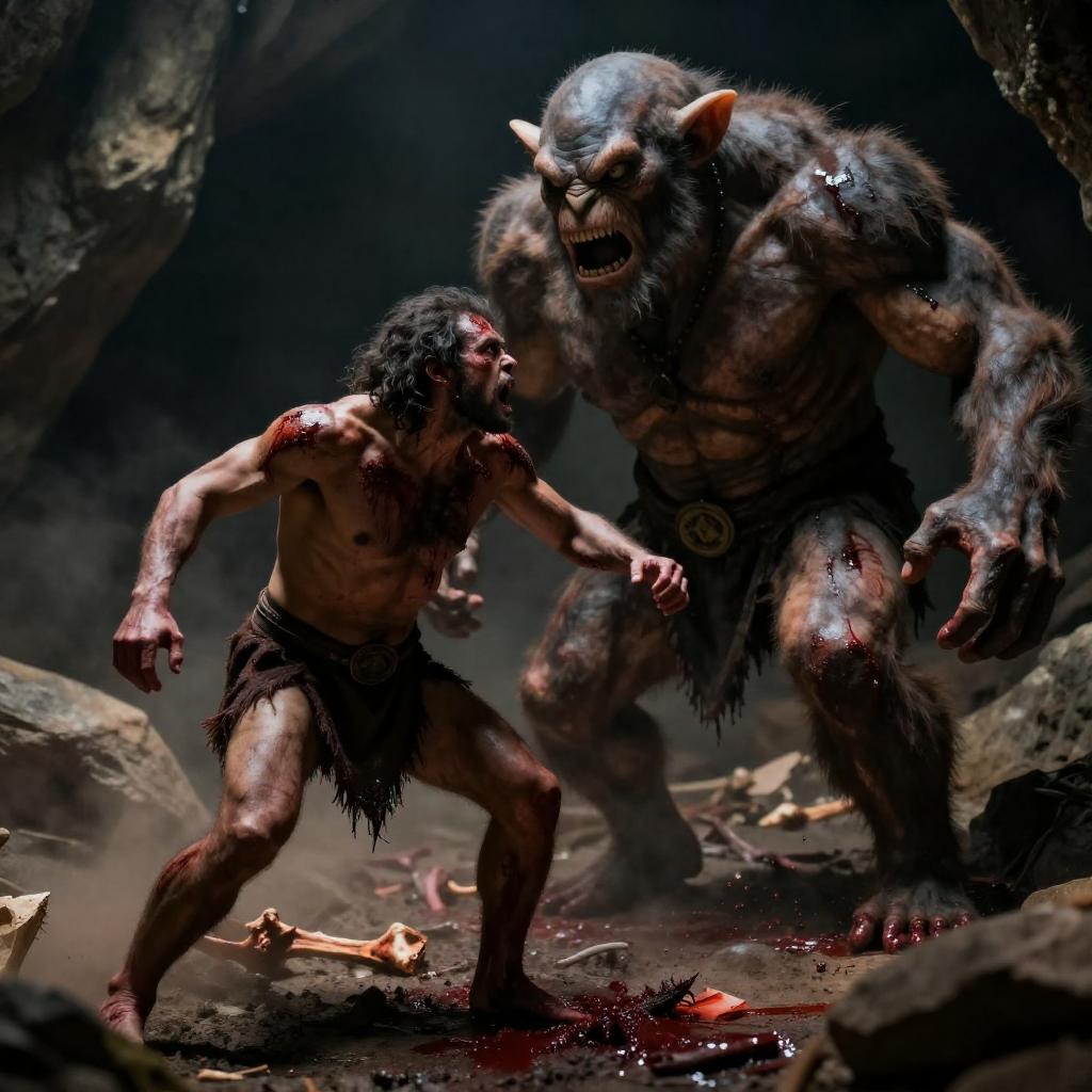 Photo of neanderthal fighting a giant cyclops in a cave, screaming, bloody mess, broken bones, bleeding wounds, gore, cinematic style