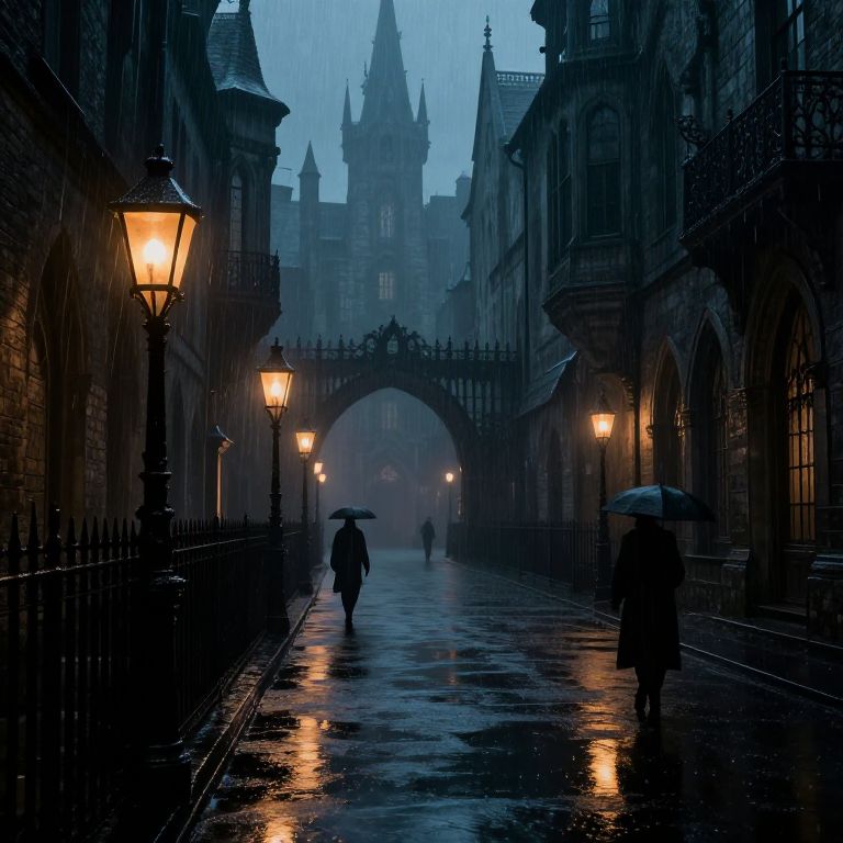 Dark gothic city art featuring a rain-soaked street with glowing lanterns and silhouettes of shadowy figures, ornate wrought iron fences, and dramatic archways, reflecting a haunting yet beautiful blend of medieval and fantastical urban architecture.