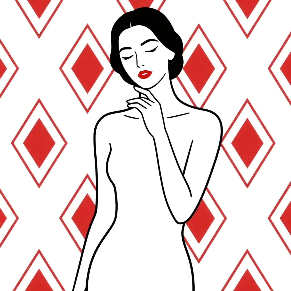 Realistic photo.Minimalist line art portrait of elegant woman with closed eyes, no gradients or fills, simple black and white with bold red lips, standing against a repeating geometric background of red diamonds, art deco inspired, clean lines, elegant pose, high contrast, vintage illustration style realistic photo