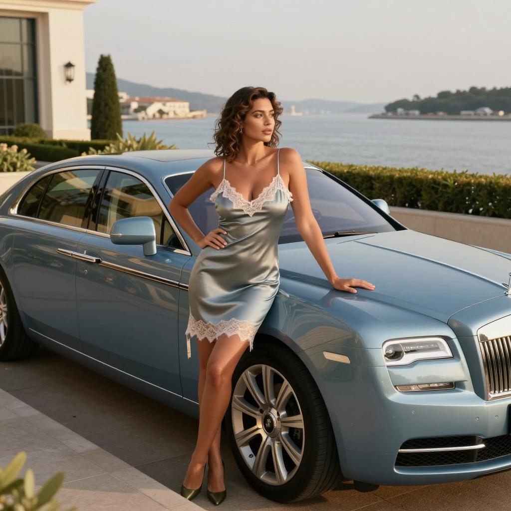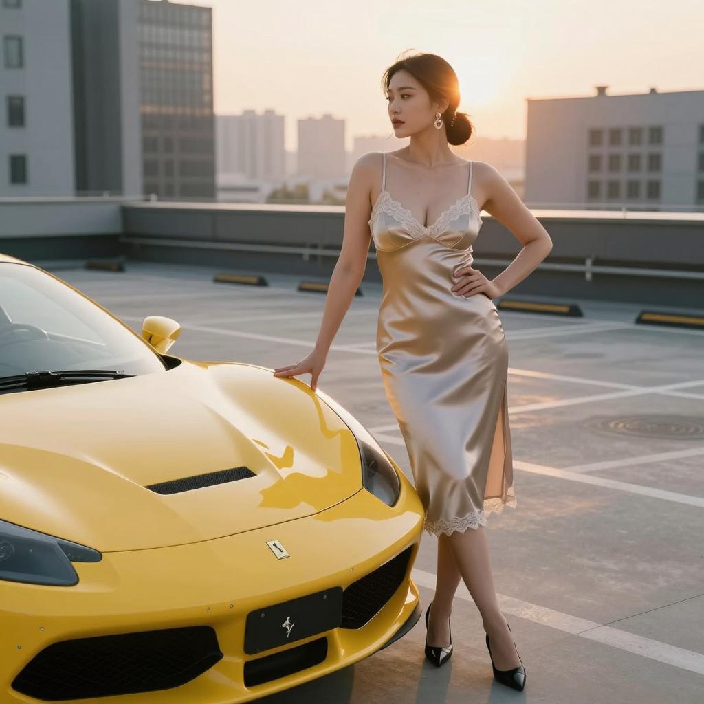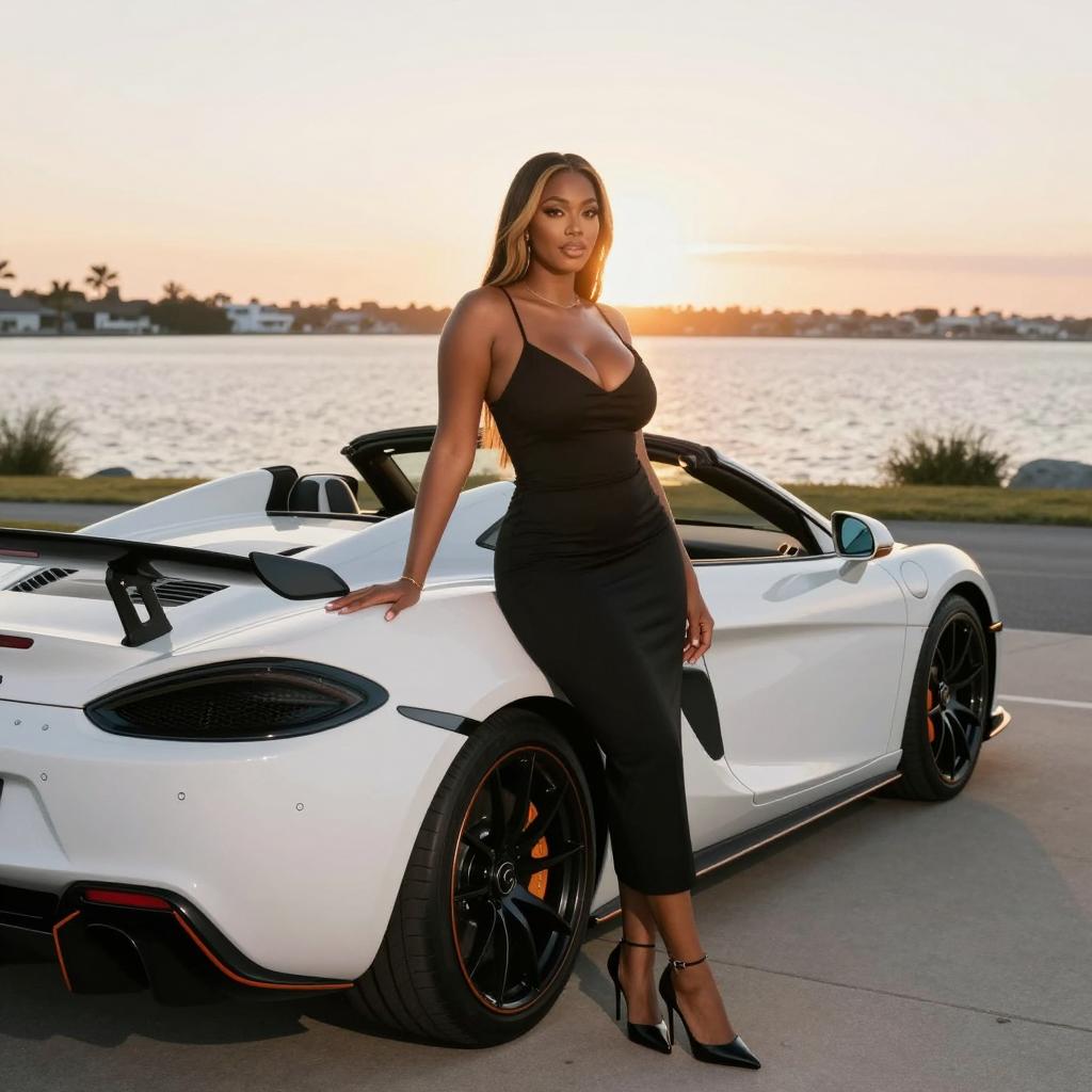 Woman, sexy with big tits, in car scene, standing beside yellow Ferrari-inspired sports car with low spoiler wearing sparkling sequin gown with open back and strappy sandals on brunette woman with Hollywood waves and bold lipstick, standing at the front of the car with one hand on the hood, legs slightly apart in palm-lined waterfront driveway with calm water behind under bright coastal sunlight with crisp reflections on car paint from medium telephoto framing compressing palm trees and background, luxury automotive fashion editorial, ultra-detailed