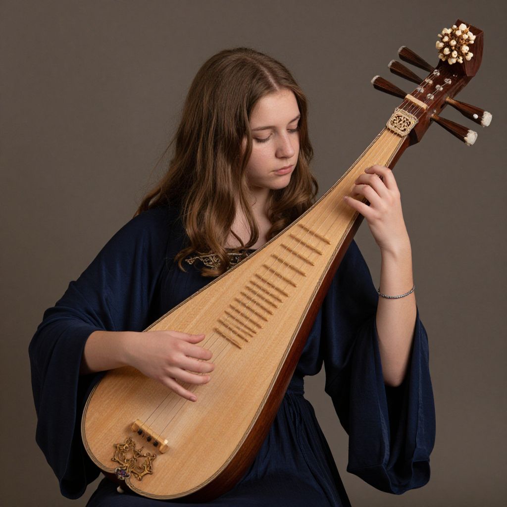 A young woman, dressed in a dark blue robe, intently plays a golden lute with intricate detailing, her hands adorned with a bracelet as she focuses on the strings against a muted brown background.
