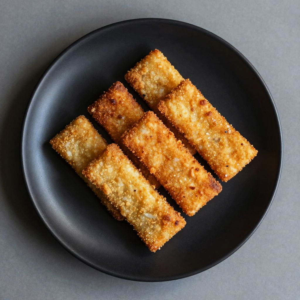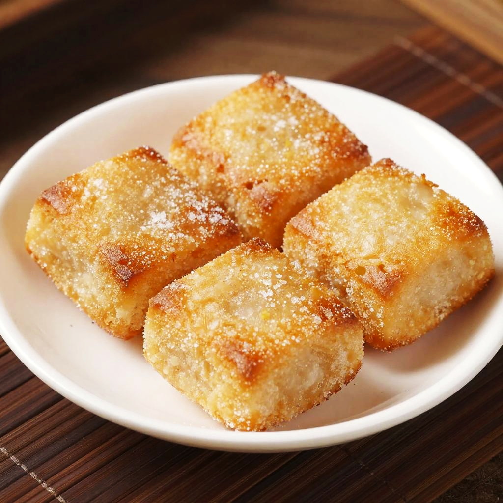 A close-up photo of a white oval plate with three golden-brown square-shaped sweet pastries dusted with white sugar. The plate is placed on a dark brown bamboo mat with a grid pattern. The pastries have a crispy, slightly textured surface. The lighting highlights the pastries' golden color and the sugar's sparkle, creating a warm and inviting look.