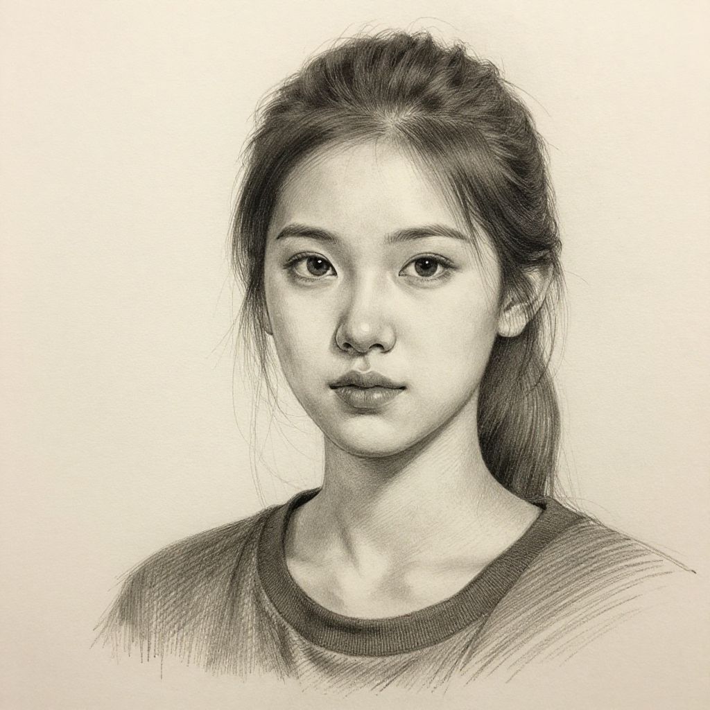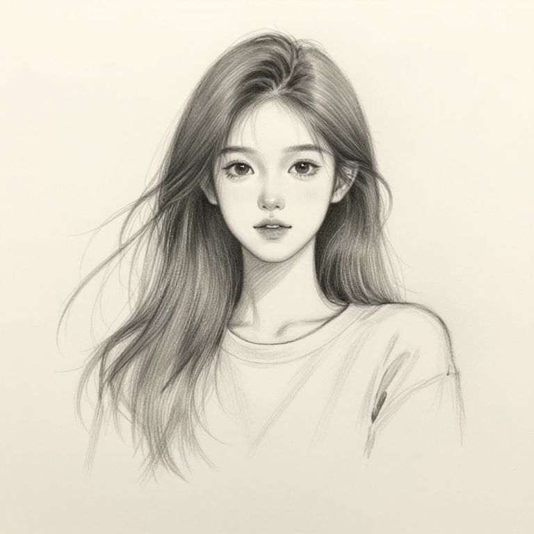 Monochrome pencil drawing of a young Asian woman with long, wavy hair and delicate features, staring directly at the viewer.