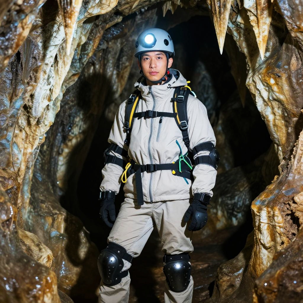 Spelunking outfit emphasizing safety gear: helmet with integrated light, padded elbow and knee guards, lightweight breathable jacket, set inside an illuminated limestone cavern