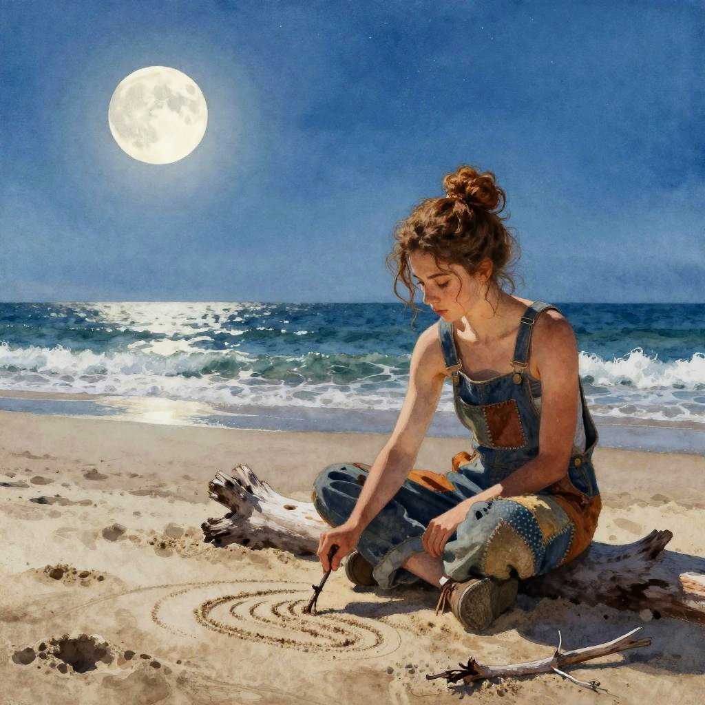 Wide shot, 1person, solo, youthful visage with deep brown eyes beneath a messy bun of caramel locks, wearing rustic patchwork overalls, standing on a moonlit beach, sitting cross-legged on driftwood, sketching lines in the sand with a drift twig, starry sky, full moon, tranquil ocean waves, watercolor painting style, blue background