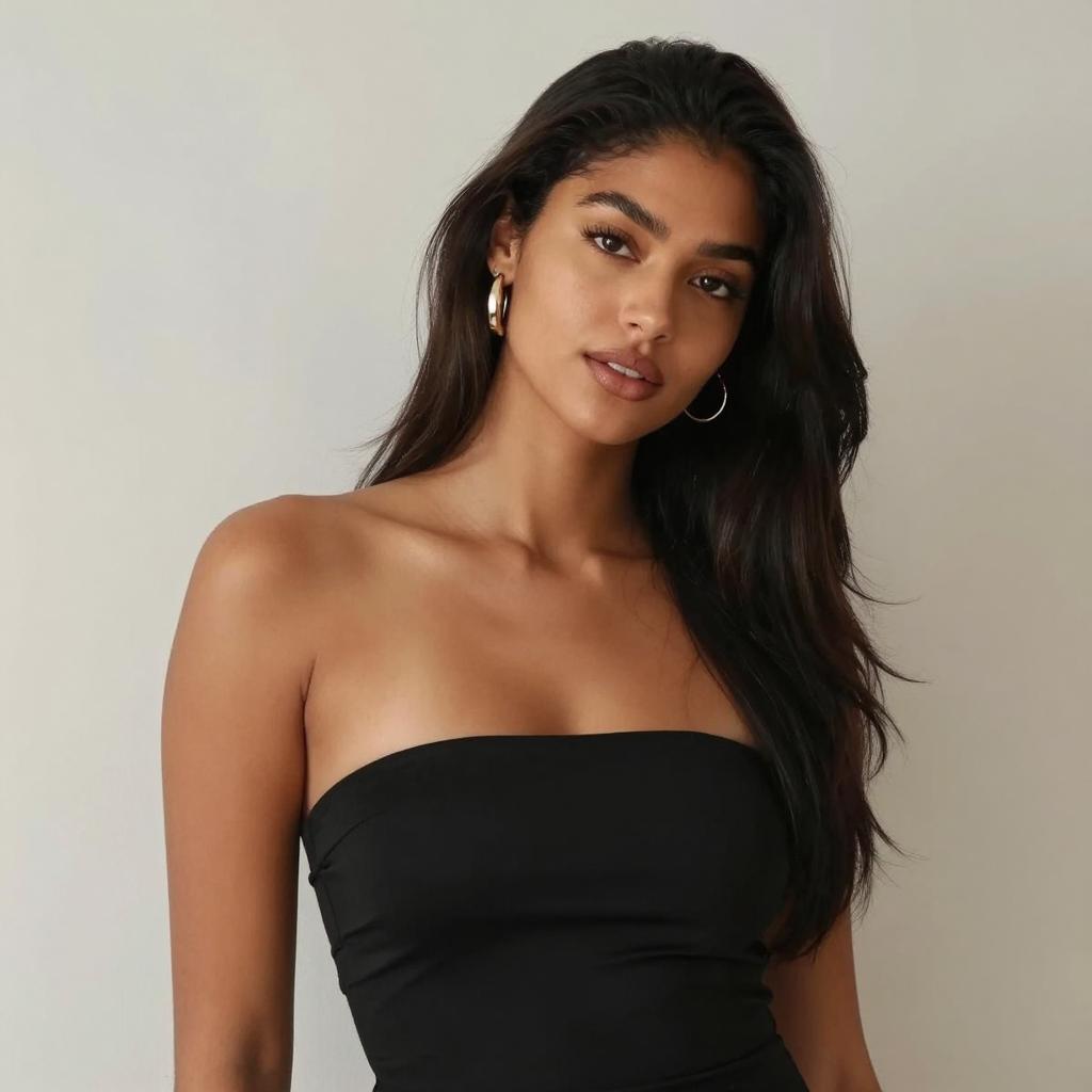 Portrait of a dark-skinned young woman with long black hair wearing a strapless black dress and gold hoop earrings. She is standing indoors against a plain light background, with a subtle smile and head slightly tilted, showing bare shoulders and collarbones.