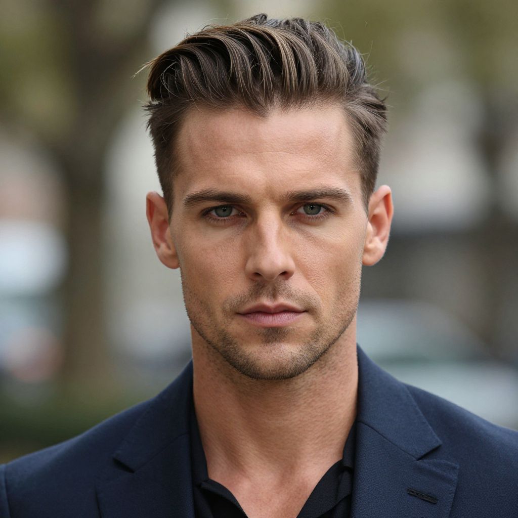 Slick Back Undercut, fit european man, realistic photography, natural lighting, urban street style, confident posture, high detail, cinematic depth of field