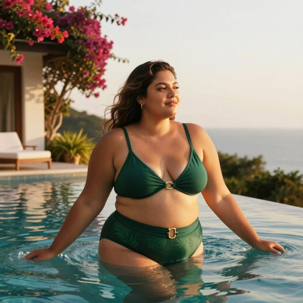 A portrait of curvy plus-size Latina woman in her 30s in intimate infinity pool at a luxury villa at golden hour, framed by bougainvillea and a distant coastline, bathed in warm natural sunlight, wearing emerald green high-waisted bikini with gold hardware and a subtle leaf pattern, shallow depth of field focusing on her relaxed expression and realistic skin texture, natural hair gently flowing, capturing a serene and inviting summer vibe.
