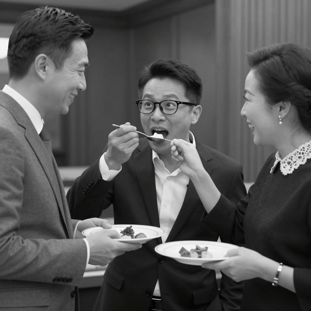 Black-and-white photograph of three people. Man on left in suit, holding plate, feeding man in center with glasses, open mouth, eating from spoon held by woman on right in dark dress with lace collar, holding plate. All smiling. Background includes blurred wooden ure.