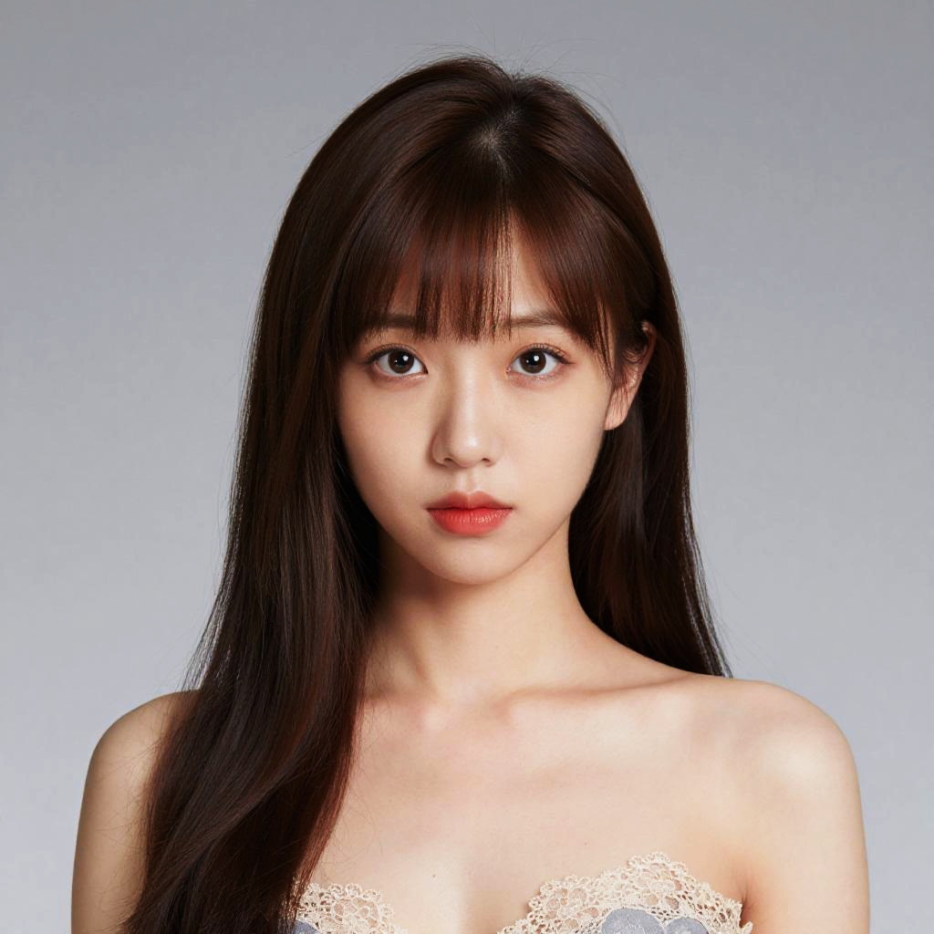 Close-up portrait of a young East Asian woman with long dark hair and straight bangs, looking directly at the camera. She has flawless pale skin, natural makeup, glossy lips, and expressive dark eyes with long eyelashes. The subject is wearing a beige strapless top, highlighting her slender neck and shoulders. The background is plain grey, emphasizing the clean and detailed facial features and smooth skin texture.