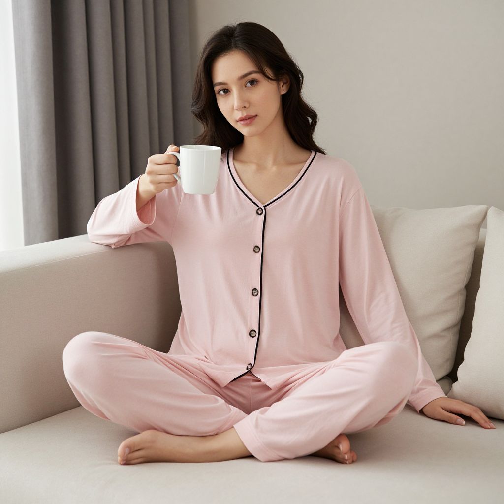 Woman sitting gracefully on a beige sofa, wearing a long-sleeve pink nightdress with black trim and buttons, holding a white ceramic mug while surrounded by soft pillows and curtains in a cozy indoor setting.