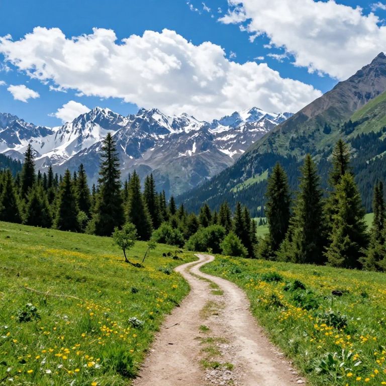 This is a vibrant photograph of a mountainous landscape. A narrow, winding dirt path leads through a lush, green meadow dotted with small yellow flowers. Dense evergreen trees line both sides of the path, eventually giving way to towering, rugged mountains with patches of snow on their peaks. The sky above is bright blue with fluffy white clouds.