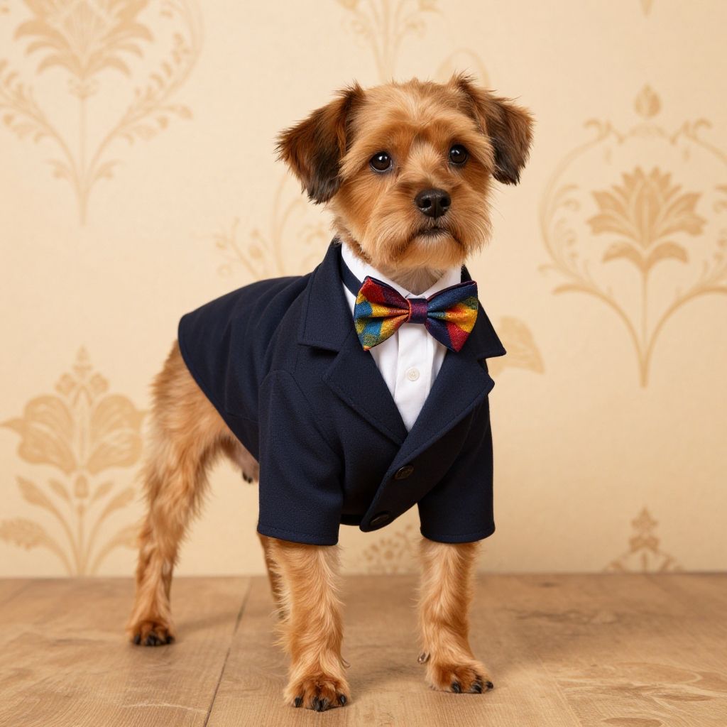 Preppy dog wearing a stylish navy blazer and a colorful bow tie, standing confidently against a classic wallpaper background with floral patterns, warm lighting, elegant and charming atmosphere, detailed fur texture, vintage style.