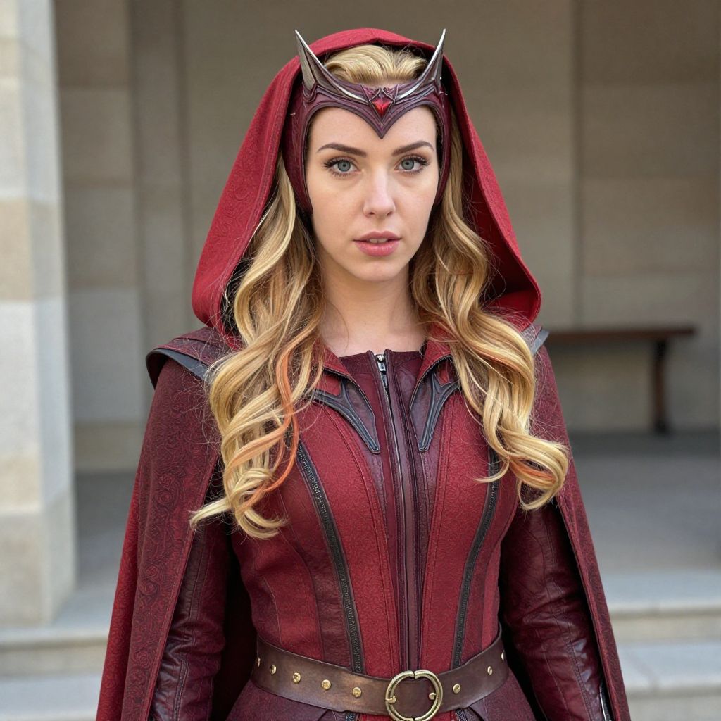 "scarlet witch full costume, 1girl, solo, hat, witch hat, looking at viewer, long hair, dress, brown hair, blurry background, blurry, red headwear, upper body, outdoors Realistic photo of casual sexy person with pretty face"