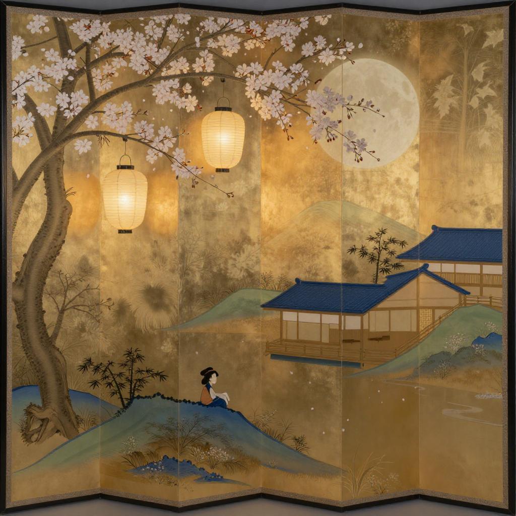 Tawaraya Sōtatsu, renowned for their Rinpa style works, creates captivating scenes of Moonlit lantern festivals rendered across gold-leaf screens with drifting cherry petals set against a backdrop of traditional Japanese landscapes.