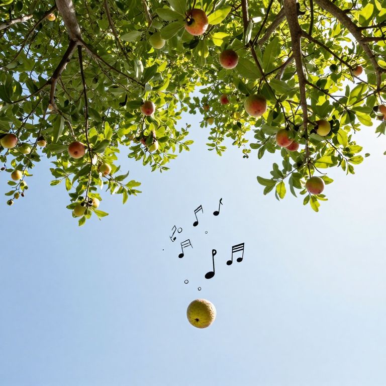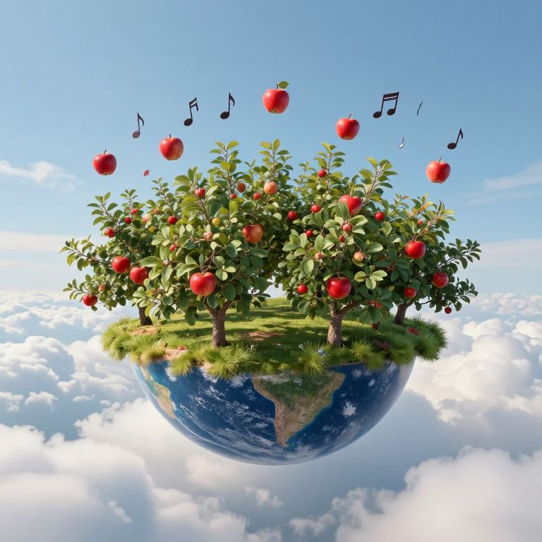 A whimsical apple tree floats serenely above the clouds, its roots reaching downward while ripe red apples scatter mid-air, accompanied by playful musical notes dancing through the ethereal sky.