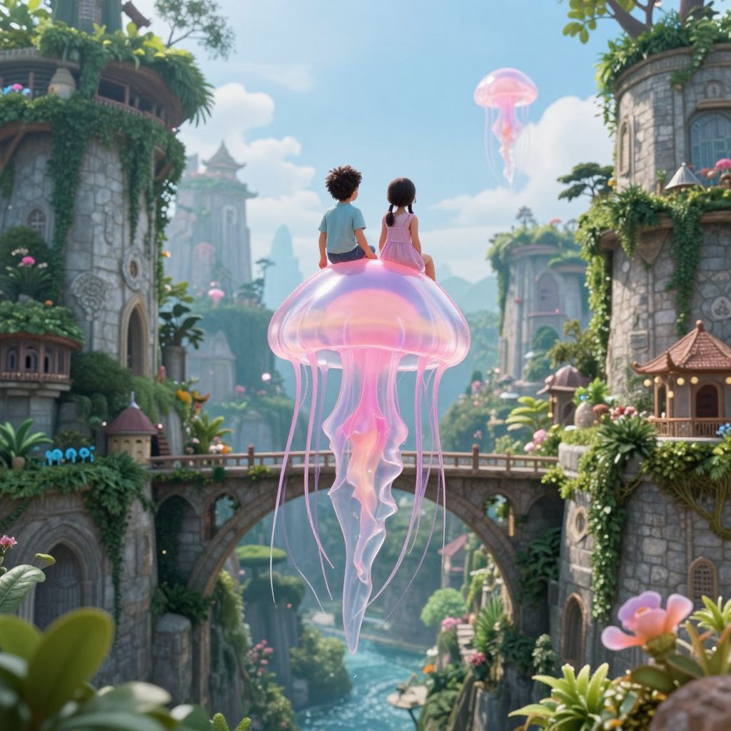 Two children sit atop a vibrant pink, translucent jellyfish as it floats gracefully above a fantastical sky-city, where ancient stone buildings are entwined with lush greenery, arched bridges span ethereal canyons, and another jellyfish drifts serenely in the distance.