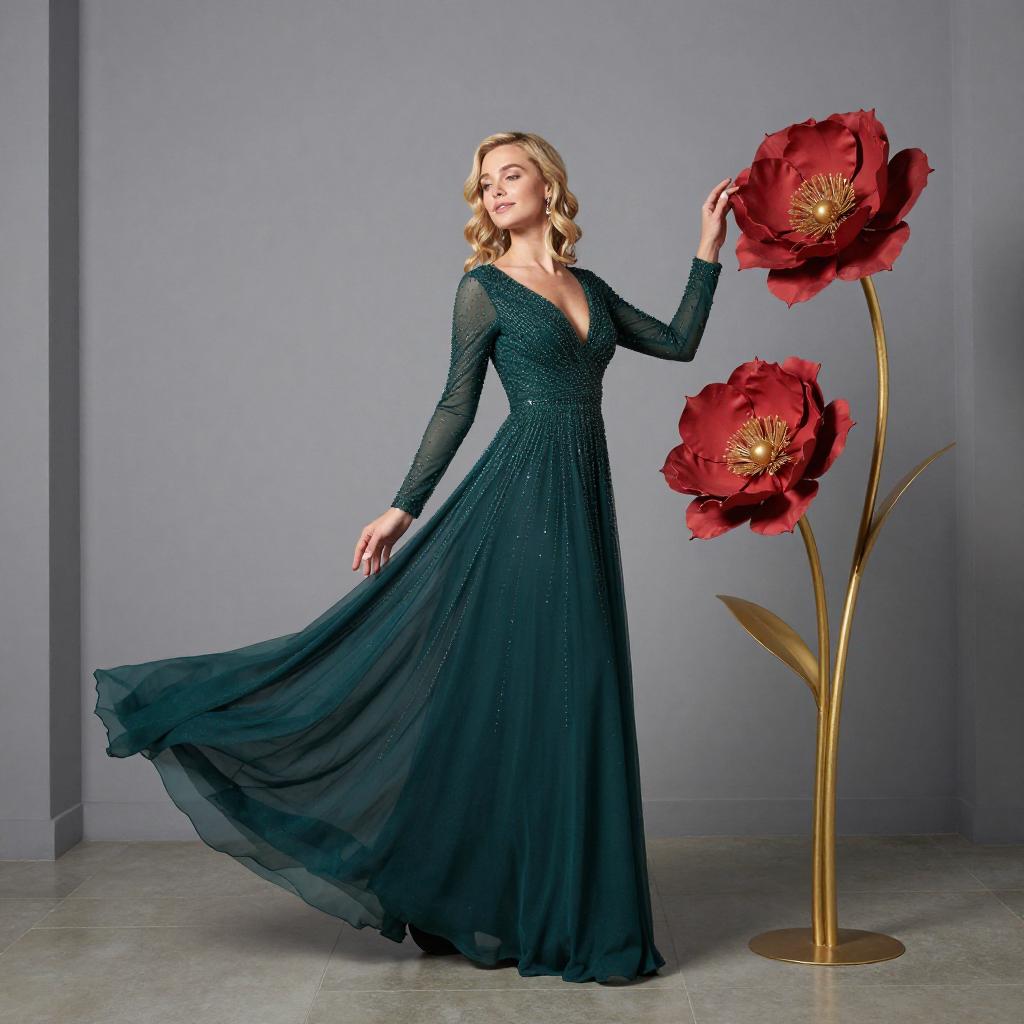 Photograph of a blonde woman with wavy hair, wearing a deep green, long-sleeved, V-neck gown with sparkling embellishments and a flowing skirt. She stands in a modern, gray-walled room, touching a tall, red flower sculpture with gold stems on her right.