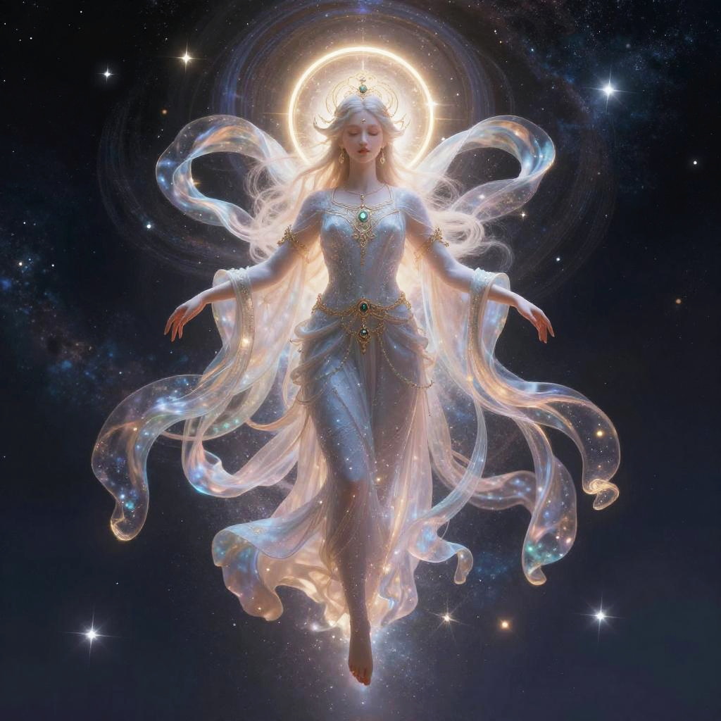 Digital art of a glowing, ethereal angelic woman with flowing white ribbons, celestial halo, and starry background, floating gracefully.