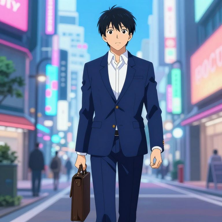 Anime-style drawing of a young man in a blue suit, white shirt, holding a briefcase, walking down a brightly lit, neon-lit urban