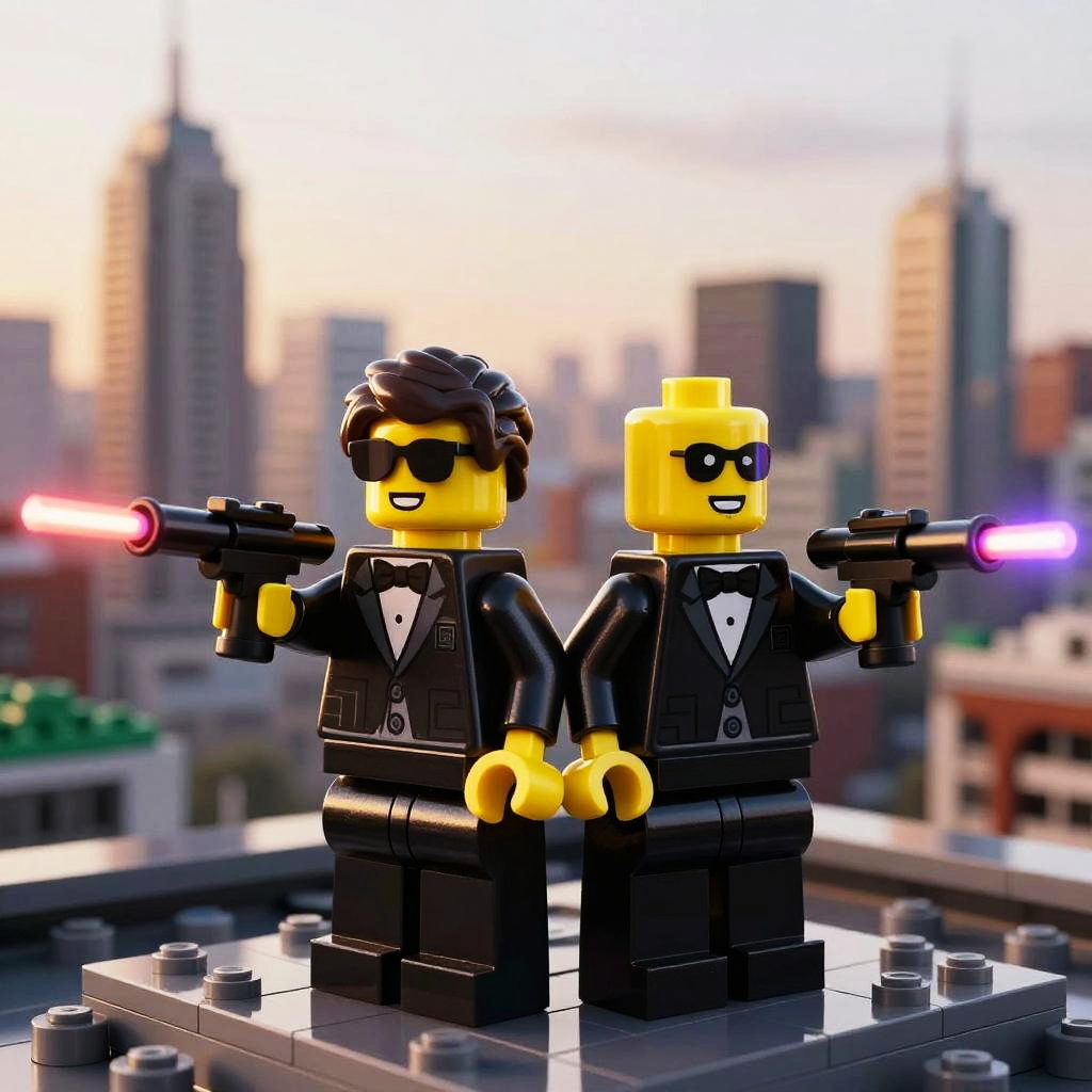 Lego men in black tuxedos and sunglasses, standing back-to-back with laser guns drawn on a rooftop overlooking a sprawling Lego metropolis at dusk, cinematic lighting with warm sunset colors and cool shadows, intense atmosphere