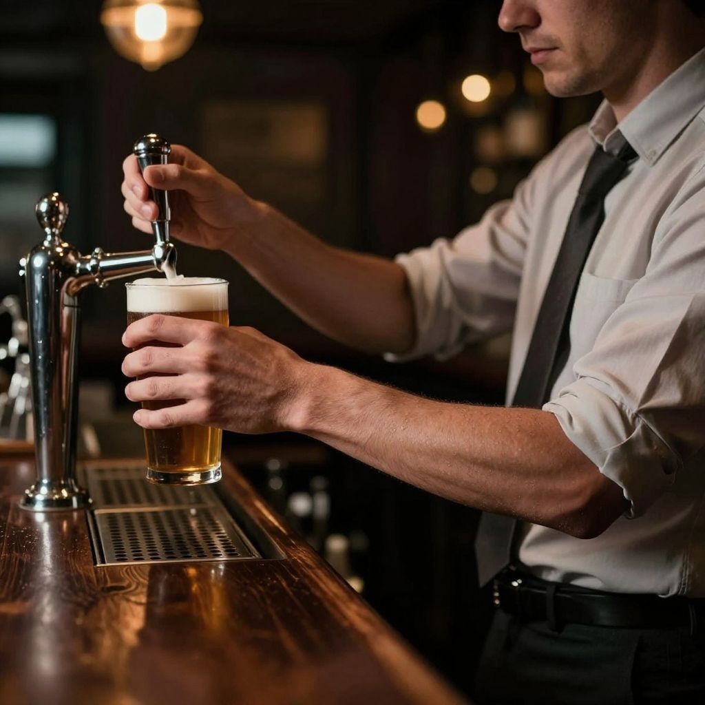 DEN_eliin_OF, (working in a dark atmospheric bar, working behind the bar, pulling pints, bar, dark wood bar, atmospheric, wearing a shirt and tie and skirt:1.2), bokeh, f1.4, 40mm, photorealistic, raw, 8k, textured skin, skin pores, epiCRealism