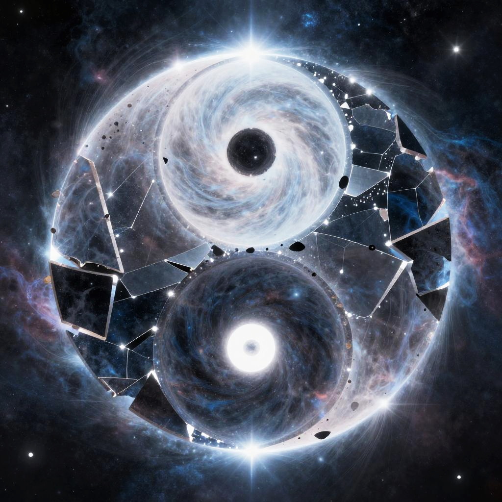 Order and chaos symbol depicted as yin-yang with fragmented shards and flawless symmetry, cosmic nebula backdrop, glowing aura, surreal digital art