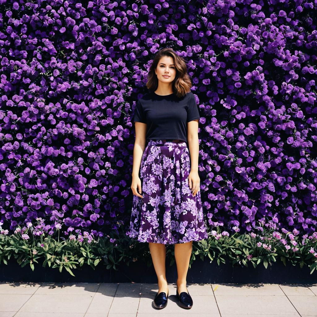 A young woman with light skin and brown wavy hair stands outdoors against a vibrant purple flower wall. She is wearing a black short-sleeve top paired with a purple floral midi skirt and black loafers. The scene is lit by clear daylight, with the paved ground visible beneath her feet, creating a casual and stylish atmosphere.