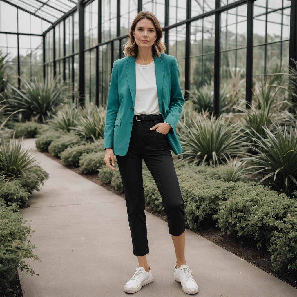 Photo of a Extensive A-line woman, Beachy Ccnn Shag, minimalist outfit, monochrome palette, neutral tones, sleek lines, tailored Summit Teal blazer, white cotton t-shirt, black slim-fit Relaxed Denim Trousers trousers, leather Vintage Kick Sneakers, minimalist watch, modern, understated elegance, Botanical conservatory, Mystical Light Capture