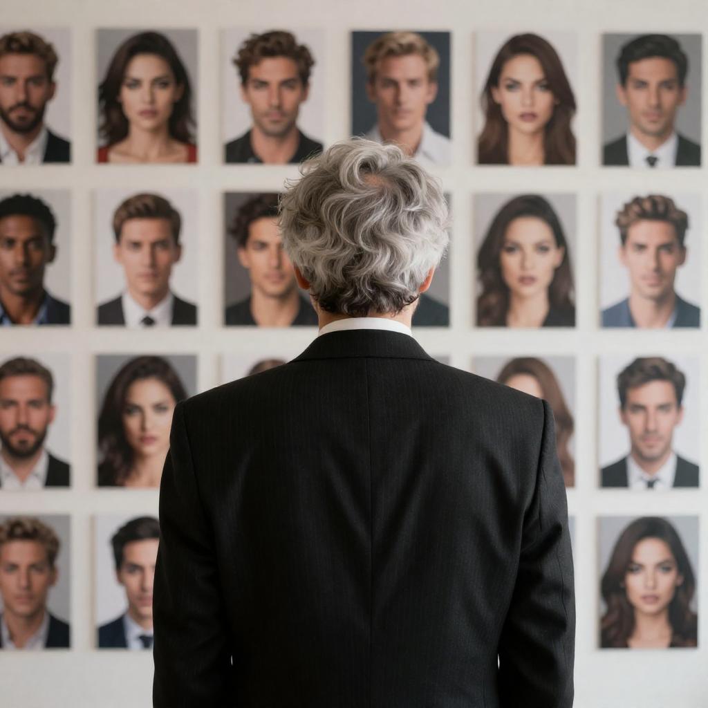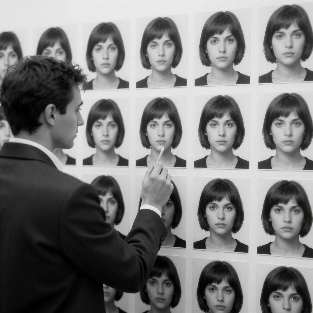 Black-and-white photograph of a man in a dark suit holding a pencil and examining a large grid of identical portraits of a young woman with short, dark hair and a serious expression. The woman wears a dark top and her images are arranged in a repetitive pattern covering the entire background, while the man stands on the left in profile view, head slightly turned toward the portraits.