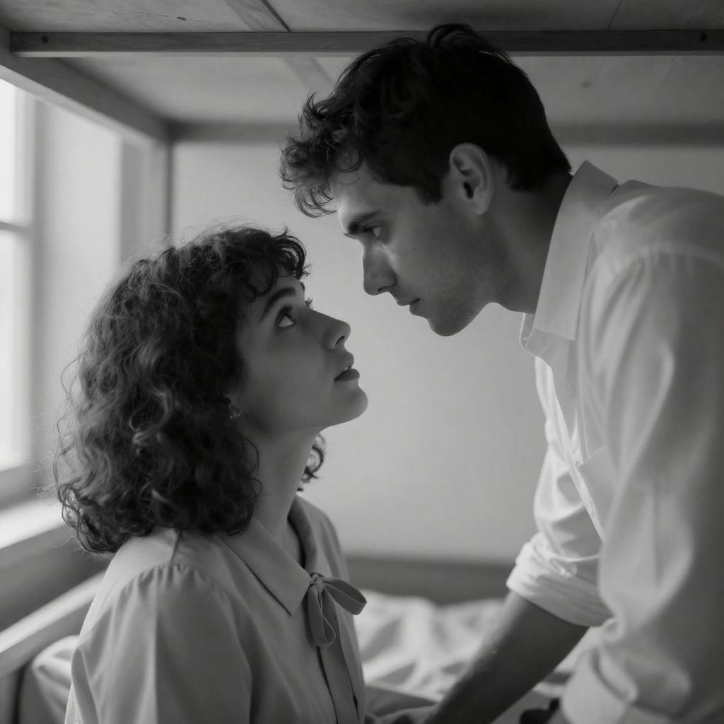 Black-and-white photograph of a man in a dark suit holding a pencil, standing to the left. Behind him, a grid of identical portraits of a young woman with short, dark hair and serious expressions. Woman's portraits occupy the entire background, creating a repetitive pattern. Man's profile visible, head slightly turned. Pencil held in his right hand, poised to draw.