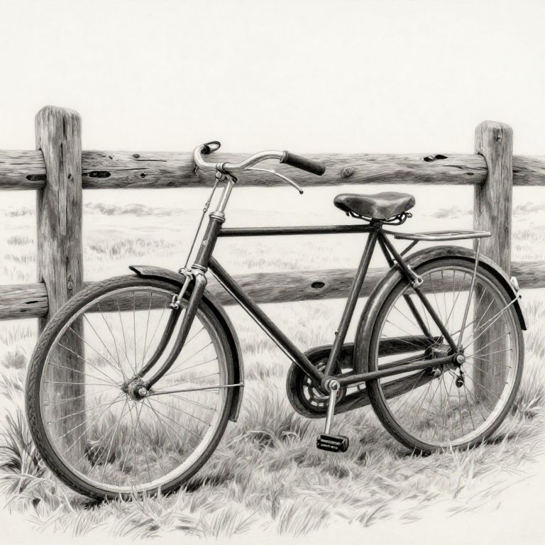 Realistic drawing ideas depicting a vintage bicycle resting against a rustic wooden fence in an open field, detailed textures on metal and wood, subtle wear and tear marks, and natural lighting to evoke a nostalgic, timeless atmosphere in realistic pencil art.