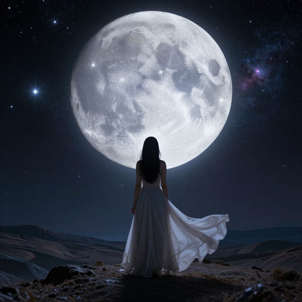 A woman in a flowing dress stands on a cosmic landscape, gazing at a large, detailed moon with a starry universe in the background.