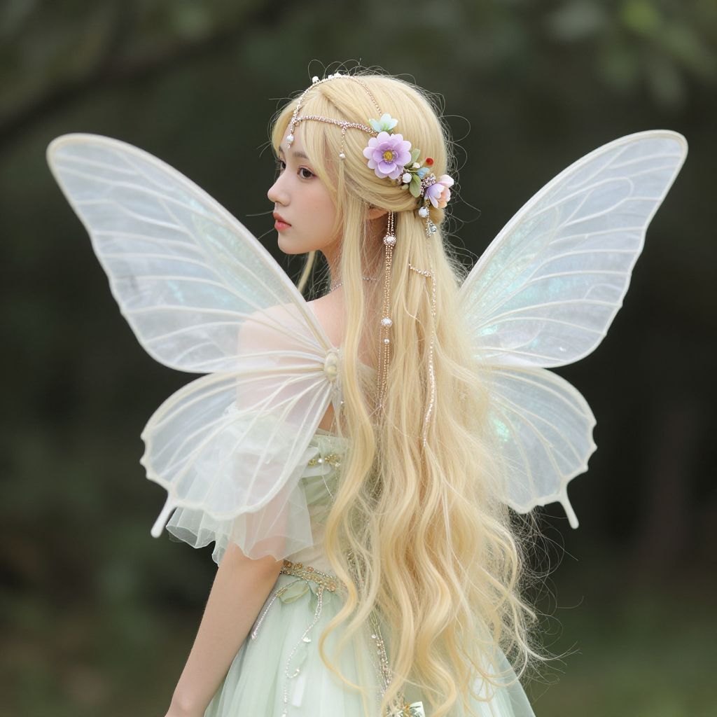 Fairy costume book week, 1girl, wings, solo, fairy, blonde hair, flower, hair flower, dress, fairy wings, jewelry, hair ornament, long hair, insect wings