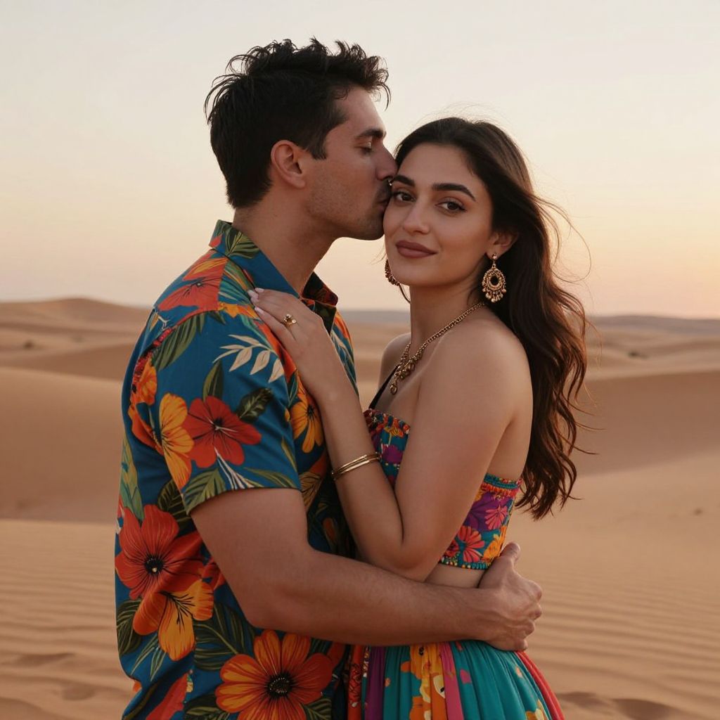 Romantic embrace captured in a desert landscape, featuring a man in a vibrant floral shirt kissing a woman's cheek as she gazes forward, both dressed in colorful attire under a soft sunset sky.