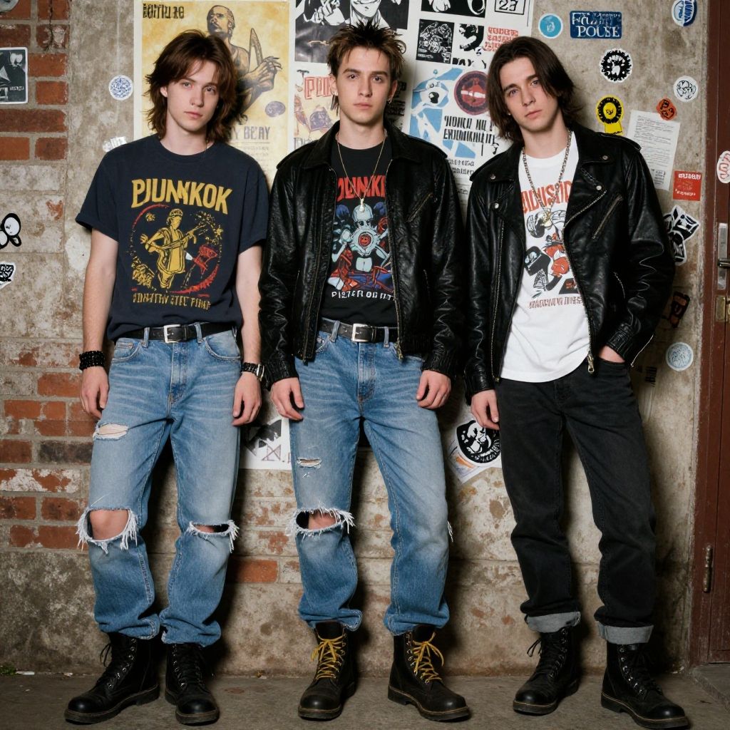 Photograph of three young men standing side by side against a white background. All wear casual outfits: black leather jackets over white t-shirts, blue jeans, and black shoes. The left man has spiked black hair, the middle man has blonde, slightly messy hair, and the right man has straight black hair. Each wears a necklace and has a belt with a silver buckle. The left and middle men have slightly relaxed stances, while the right man stands more upright. The image has a high-contrast, slightly glossy finish, emphasizing the textures of the leather and denim.