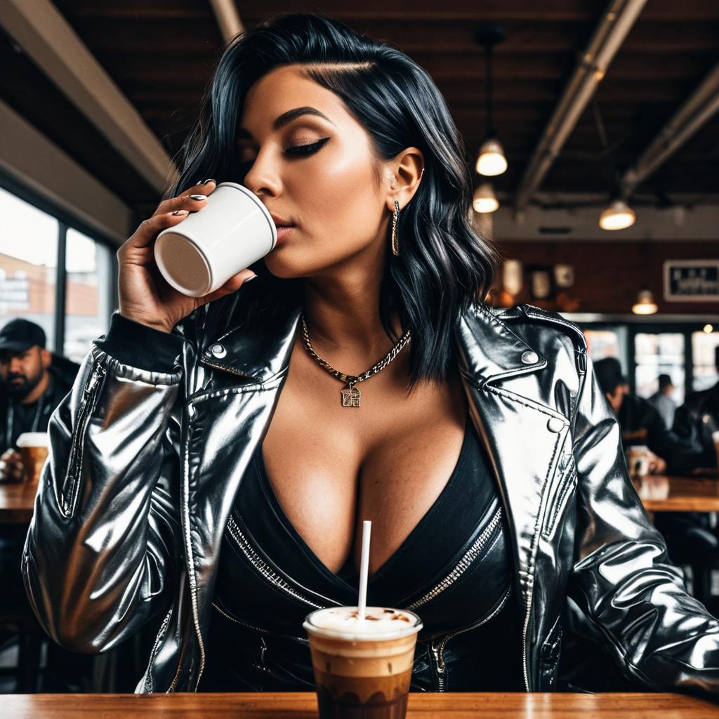 Digital illustration of a confident dark-skinned woman with long white hair wearing a sleeveless denim jacket, white crop top, and denim shorts. She is holding two red soda cans with stylized logos, accessorized with large gold earrings, necklace, and bracelet. The background features a gradient from pink to purple with abstract and silhouette cityscape elements.
