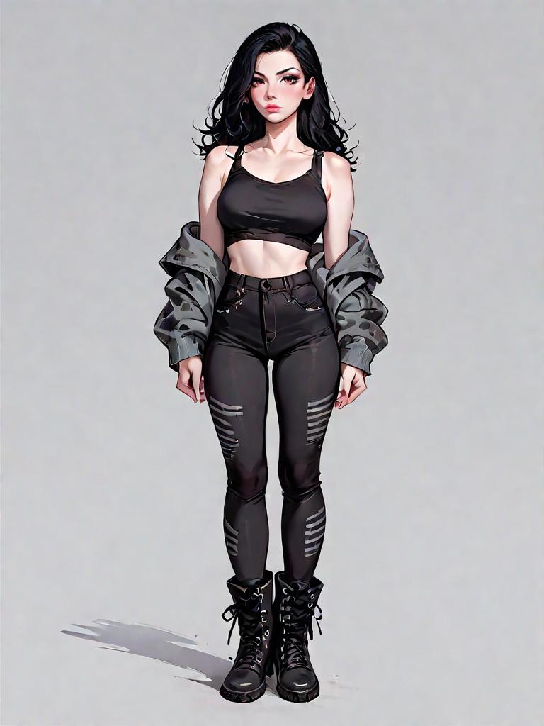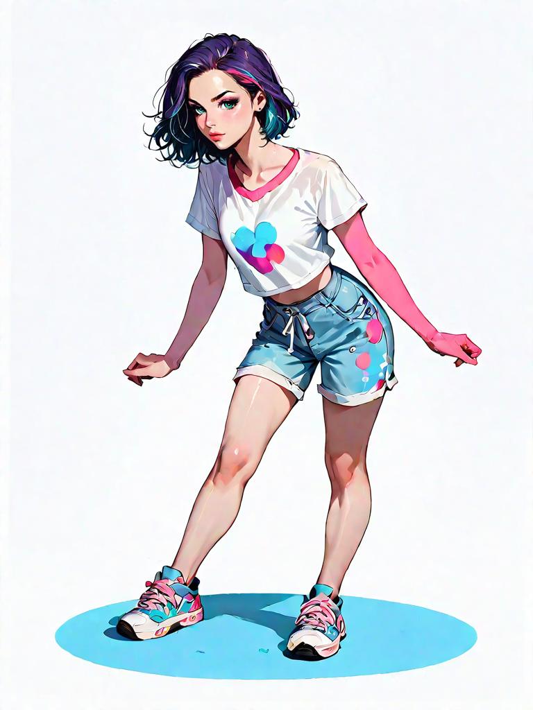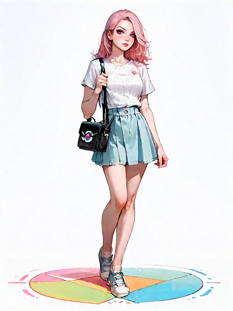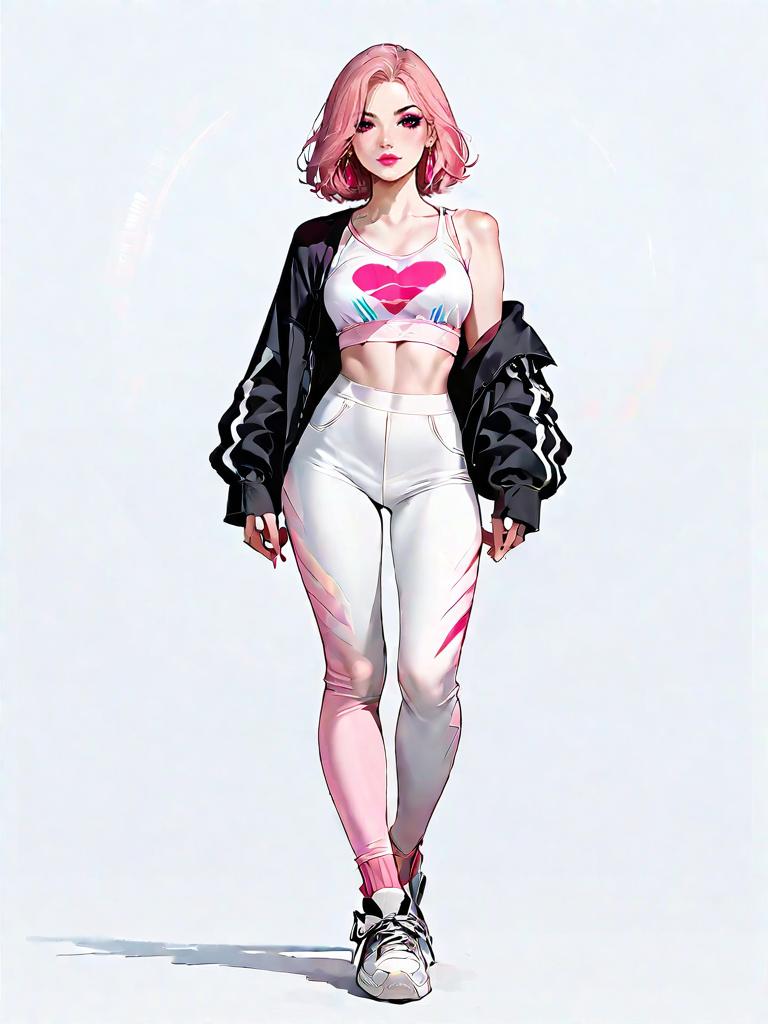 Digital artwork of a stylish young woman with pink hair wearing activewear. She has a light pink crop top with a heart design, white high-waisted leggings with pink accents, a black jacket with white stripes, and white lace-up sneakers. The image is a full body shot against a clean studio background.