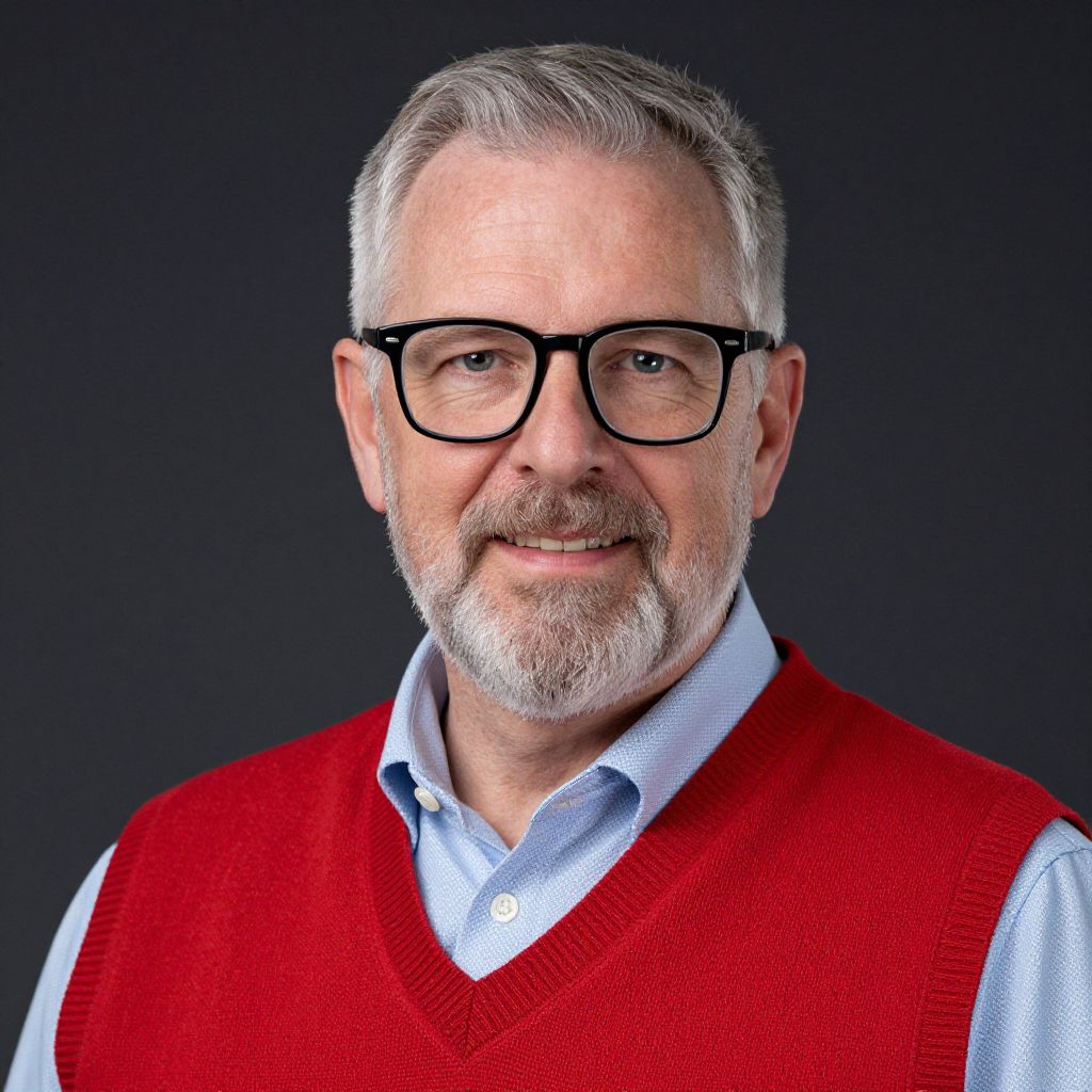 Photograph of a middle-aged man with gray hair and beard, wearing black-framed glasses, a red sweater over a blue button-up shirt, smiling