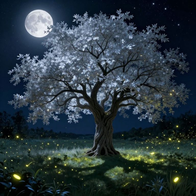 Digital artwork of a glowing white tree under a full moon, surrounded by glowing fireflies in a dark, starry night sky.