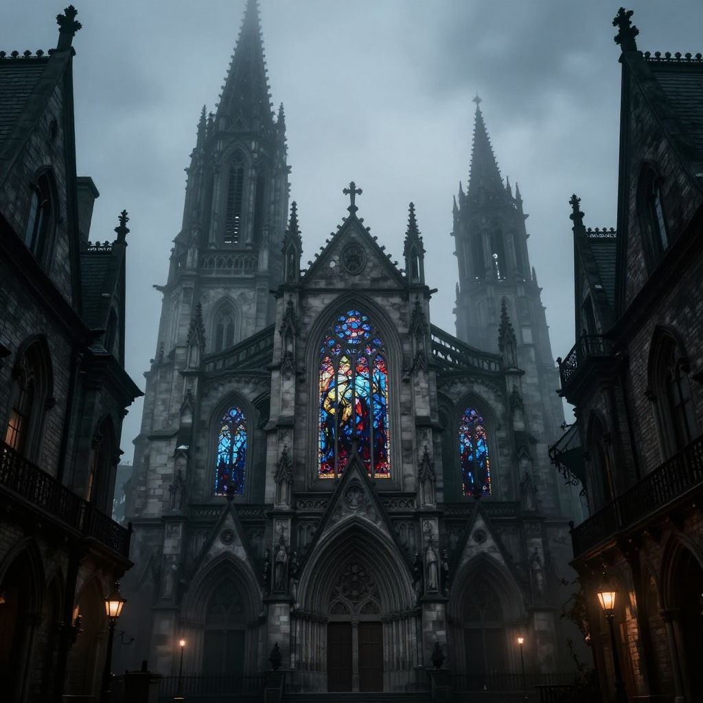 Bloodborne architecture showcasing grand cathedrals with stained glass windows, looming bell towers, dense fog enveloping narrow passageways, Victorian Gothic horror city inspired by dark fantasy aesthetics