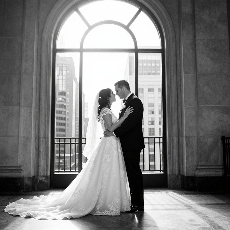This black-and-white photograph captures a romantic moment between a bearded man and a woman with long, wavy hair. The man, wearing a dark blazer over a light shirt, leans in to kiss the woman, who is dressed in a white, short-sleeved blouse. They are standing close, with the woman's hand gently touching the man's chest. Both are smiling, eyes closed, exuding affection. The background is blurred, featuring indistinct city buildings, adding depth to the image. The photograph emphasizes the intimate connection and emotional chemistry between the couple, highlighted by the contrast of their dark and light clothing.