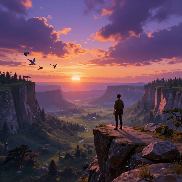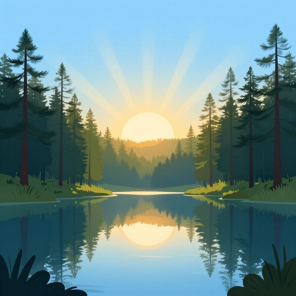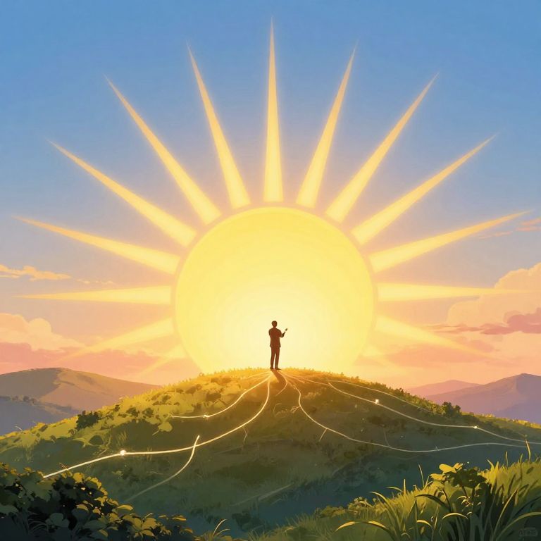 Eloquence visualized as a radiant sunburst over a peaceful landscape with a lone speaker on a hilltop, conveying inspiration and clarity, vibrant colors of sunrise, flowing lines of light connecting speaker to nature, uplifting and harmonious mood